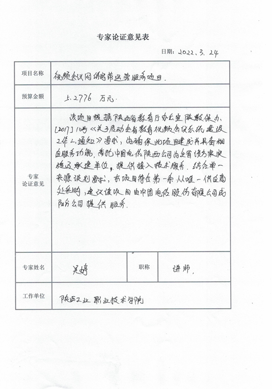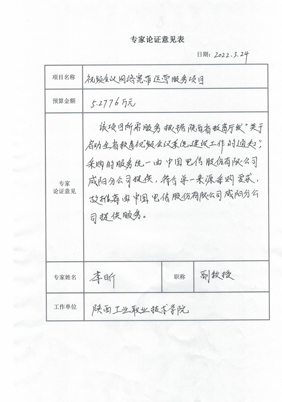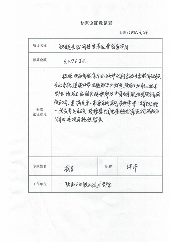 根据《关于启动全省教育视频会议系统建设工作的通知》要求及相关专家论证意见,陕西工业职业技术学院视频会议网络宽带运营服务项目拟采用单一来源采购方式,该项目拟由中国电信股份有限公司咸阳分公司承担。现将有关情况向潜在的供应商广泛征求意见。征求意见期限从2022年3月25日起至2022年3月31日止。